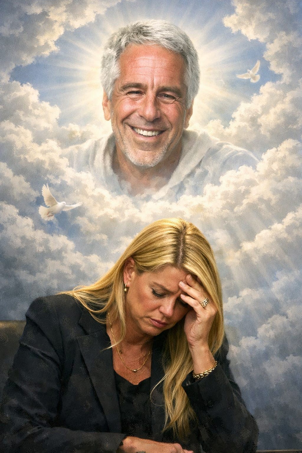 Blondi lacked the intellect/acumen/cleverness to navigate these competing imperatives: to rein in the Wild Epstein Delusions that had long been stoked across the Trump-aligned media landscape, with numbskulls like Elon Musk leading the charge, while also somehow remaining in good standing with this all-important constituency. Because if they ever loudly revolt, the Based Right millennial staffers in the White House are going to be absurdly over-attuned to it, and the bad news will eventually reach the Big Guy. An impossible conundrum, even if Blondi was a majestic PR maestro. Which she clearly wasn’t. Hence, her shrill tactic of pivoting obnoxiously to “The Dow” at a Congressional hearing nominally focused on recent Epstein-related conduct of the DOJ — which predictably became an instant and decidedly unflattering “viral moment.” Because actually addressing the substance of Epstein mania, and refuting the overwrought public misconceptions flowing from it, would’ve created an even bigger political nightmare, even if it happened to be grounded in some approximate version of reality. But sadly, Blondi was too much of a ditz to thread that needle. She still might not be fluent enough in the relevant facts/evidence/arguments to convey a properly reality-based representation, even if she were inclined to do so.