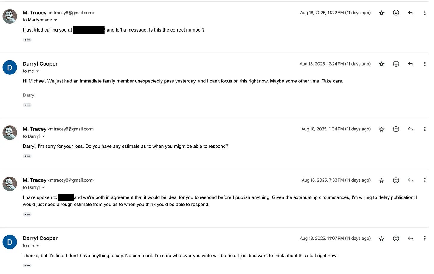 Here are the additional emails that followed. I have blacked out Darryl’s phone number, as well as the name of a person I spoke to privately:
