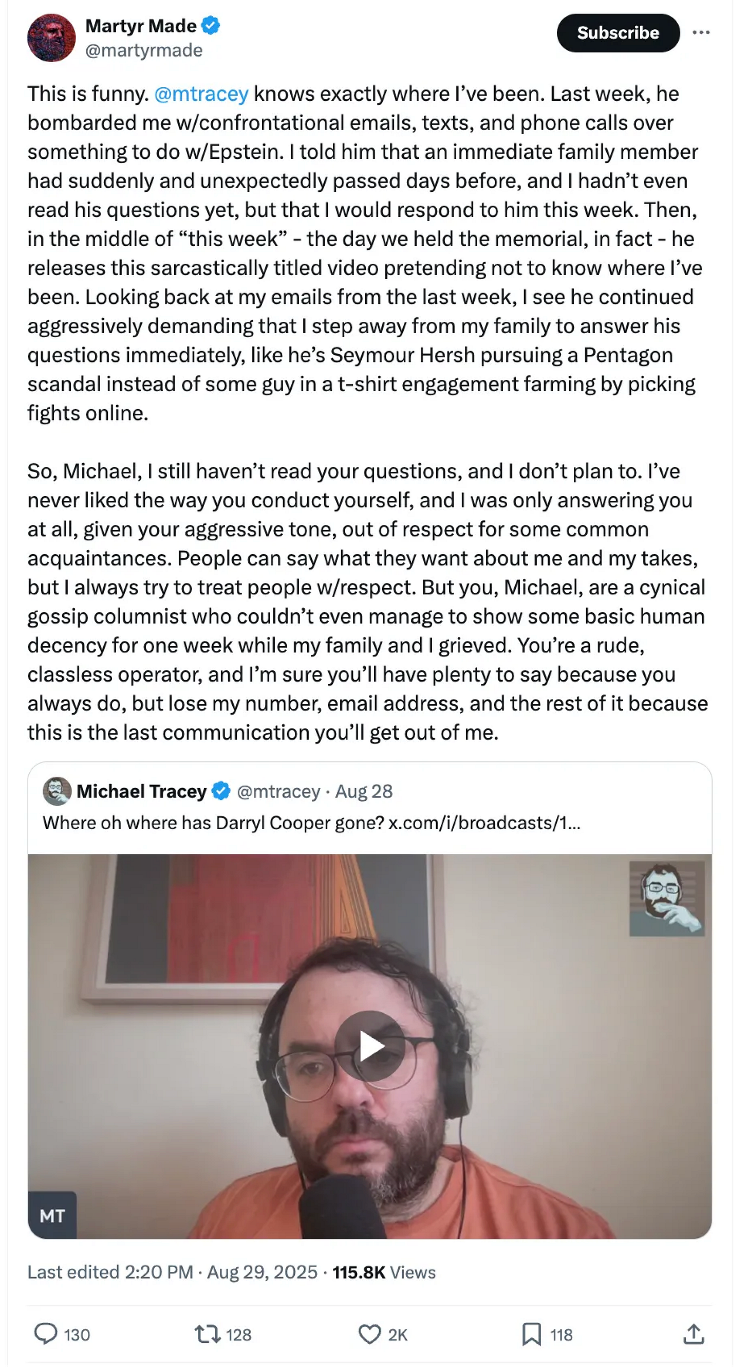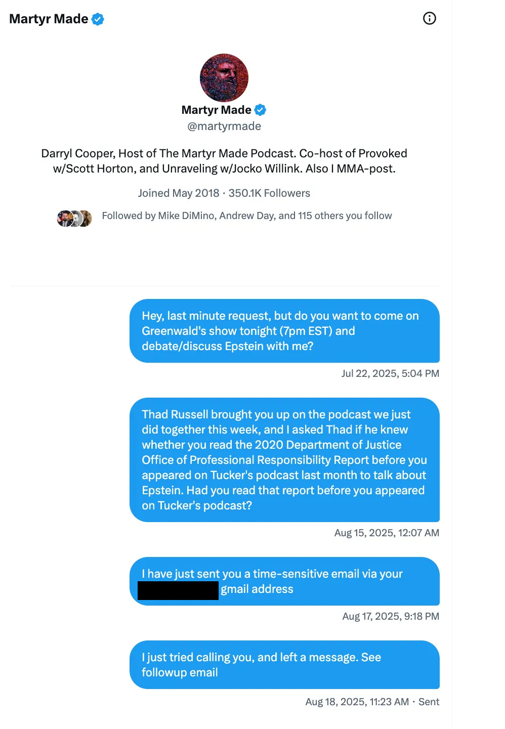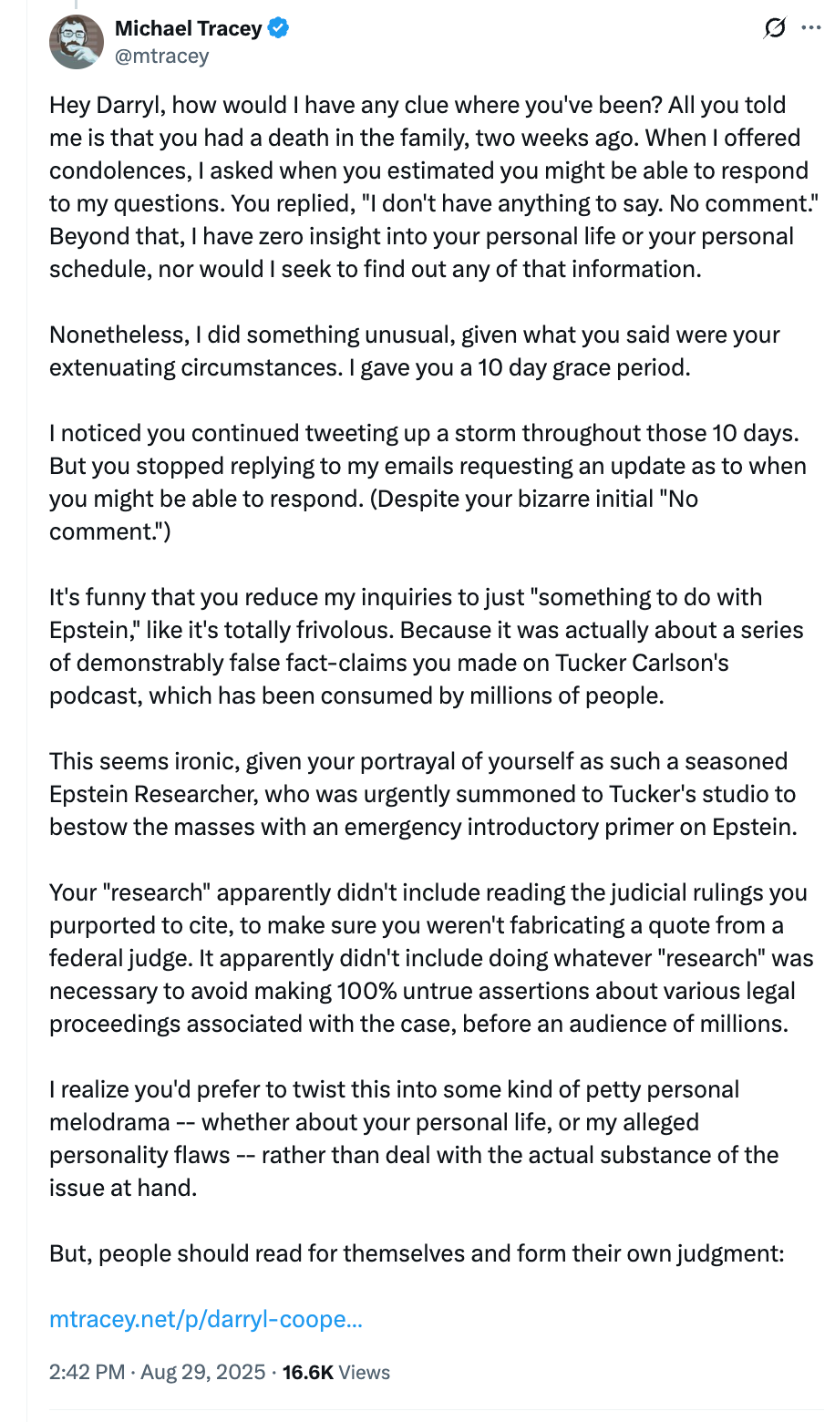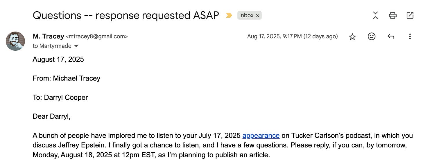 So rather than address a single substantive point I’ve raised — like his fabrication of a non-existent quote by a federal judge, or his completely untrue assertions about various legal proceedings related to the Epstein case, or a host of other false information he transmitted to an audience of millions on Tucker Carlson’s podcast — he instead deploys some tried-and-true emotional blackmail tactics. In this way, his approach is eerily similar to that of Whitney Webb, who decided to bring up the fact that she had a newborn baby when I contacted her, thereby introducing some sort of emotional burden to place on me — such that I was obliged to not add further turmoil to her personal life with my pesky emails. Although in fairness to Whitney Webb, at least she did provide some substantive response when I contacted her. Cooper, however, has provided none whatsoever. He instead decides to emphasize that a family member of his recently died. Which he’d already told me when I first emailed him, 12 days ago. Like Webb, albeit more blatantly, he tries to saddle me with some sort of emotional burden — as a person simply sending him a journalistic inquiry after engaging with his public work output. And who otherwise has zero interest in his personal life. But now I’m obliged to accomodate his personal life.
