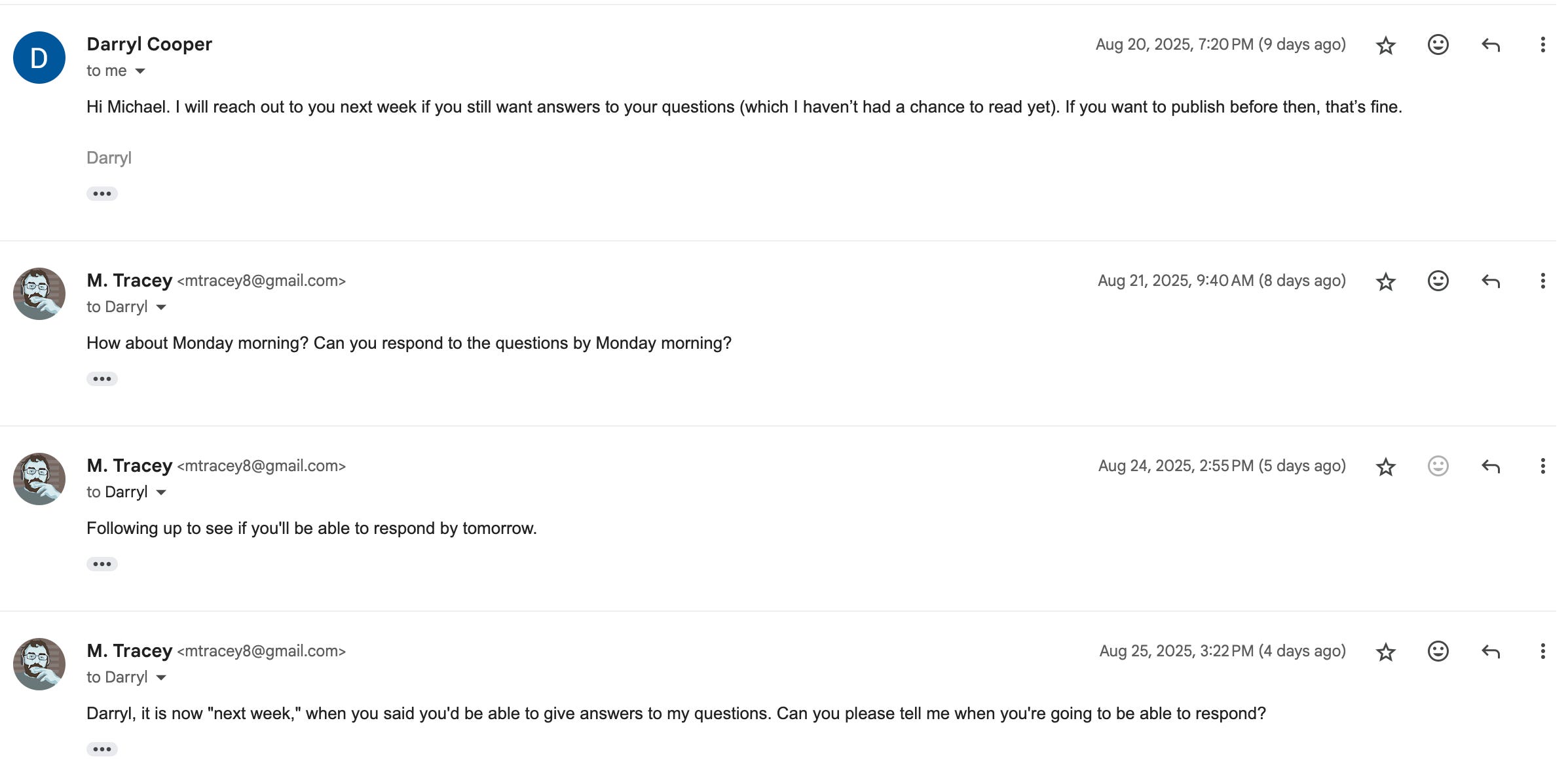 And now, here’s the entire email thread, full of shockingly “confrontational” emails that I so despicably “bombarded” him with.