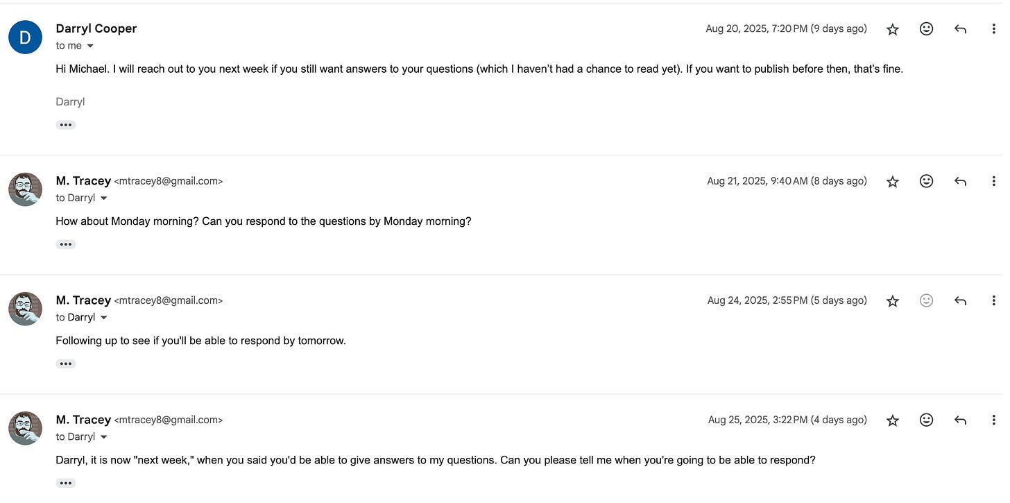 And here are the communications I so rudely “bombarded” him with. (By the way, how do you think journalists are supposed to go about seeking comment for an article? Whispering into the abyss?)