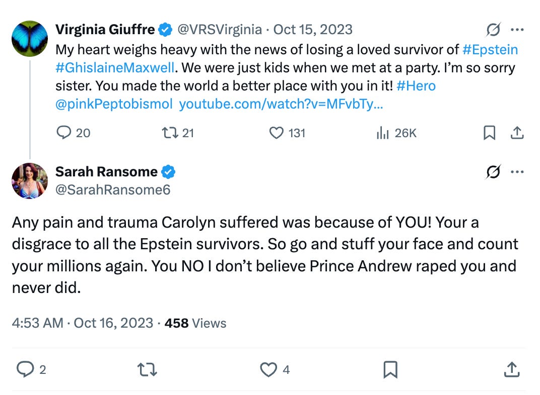 So in other words, Ransome was a certified nutcase. This didn’t stop her from getting a HarperCollins book deal, for a memoir touchingly entitled Silenced No More — nor was her nuttiness any impediment to being named as a plaintiff in some of the most consequential litigation against the Epstein estate, which ultimately led to the creation of the Epstein Victims’ Compensation Program, from which Ransome undoubtedly received a generous (tax-free!) payout — likely in the millions. Perhaps her good fortune in this regard stemmed from the perceived credibility she was afforded by her participation in Judge Berman’s wild August 2019 hearing. But as the years went by, things continued to unravel for Ransome, psychologically and otherwise. She turned on one of her high-powered lawyers, David Boies, declaring he had “betrayed” her for reasons she attempted to explain, but were increasingly indecipherable. She wrote in a 2023 affidavit: “I am infertile and have no children. I am damaged and broken because I was raped hundreds of times by Epstein while his enablers stood by and watched. My mother witnessed me die three times.” She started rebuking Boies not just as a craven betrayer, but as “Deablous,” a demon-like being. She sent rambling emails addressed to Joe Biden, Pope Francis, Vladimir Putin, Recep Erdogan, Mohammed bin Salman, among others, demanding to be granted a central diplomatic role in mediating the Ukraine war and Israeli-Palestinian conflict. She even did the unthinkable for any self-respecting “Epstein Survivor,” and condemned Virginia Roberts Giuffre:
