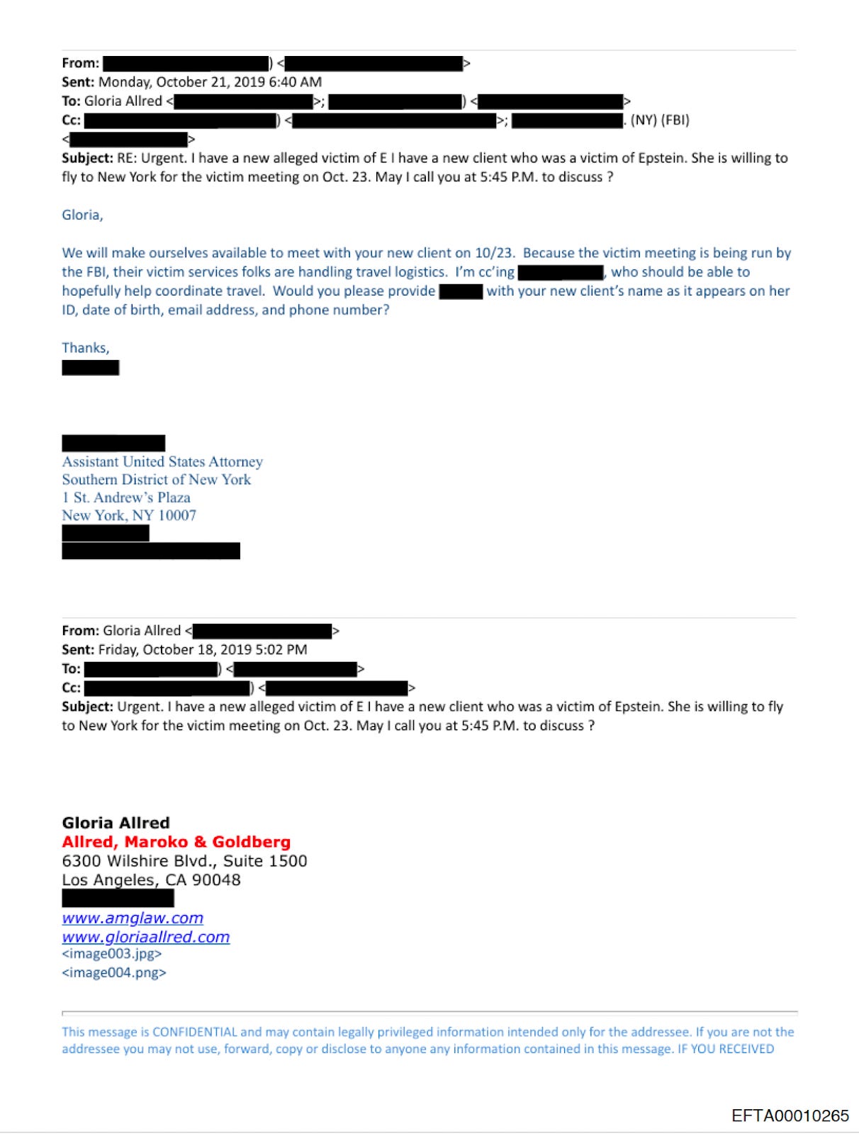 Given the expansive redactions that suffuse these latest “Epstein Files,” it’s difficult to discern whatever came of this “new client,” and if she was deemed of any “urgent” value by the Southern District of New York, which by then was in fervent pursuit of Ghislaine Maxwell, and perhaps other potential “co-conspirators” of Epstein. Either way, interfacing with the FBI and US Attorney’s office could be profitably cited in any civil litigation Allred might subsequently bring. Another chain of emails between August and October of 2020 shows Allred once again propositioning her federal contacts about “new potential victims of Epstein and some of Maxwell who are willing to speak to you and the FBI.” No clients of Allred are known to have testified in the 2021 trial of Ghislaine Maxwell, or to have played any material role in that prosecution. However, an associate at Allred’s law firm can be seen repeatedly inquiring if the Feds could please send her “documents” and “photographs” related to Allred’s clients, which would certainly have been helpful for any forthcoming lawsuits.
