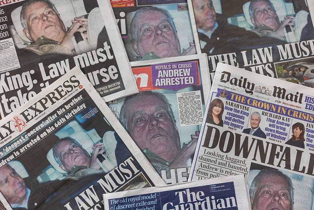 NOTE FROM MT: The following article was originally solicited by and written for Unherd, the British media outlet to which I occasionally contribute, late last week. I was asked to produce the article urgently and swiftly, given the breaking news of Andrew’s arrest, and did so, working through the night Thursday into Friday. The prose therefore contains some stylistic elements tailored to Unherd. I was even summoned to appear on an emergency Unherd podcast Friday morning, in which I discussed many of the same points I’d explain in greater detail in the article. The article was delayed, however, and went through several laborious edits — all factual queries were fully addressed by me, and I added some substantive/thematic modifications where reasonable, based on editorial input. However, I was just told this morning that the article is “not going to work,” for reasons that were not specified. The whole reason I agreed to do this for Unherd was that I thought it would be useful to get some sort of corrective in a British media outlet. But apparently that was not to be. Alas.