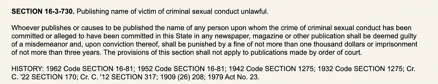 Think about this: South Carolina makes it unlawful to publish the name of a person against whom criminal sexual conduct has been “alleged to have been committed.” But anyone can allege anything! In fact, Nancy Mace, the current Congresswoman from South Carolina who is running for Governor, has made a series of wild allegations about the sexual victimization she claims to have suffered in 2023, as a sitting member of Congress in her 40s. Conceivably, it could be “unlawful” — under the technicalities of this absurd statute — for a “newspaper, magazine, or other publication” to publish the name of Nancy Mace in connection with these allegations, even though Nancy herself has made an elaborate show of publicizing the allegations. In fact, perhaps Nancy could herself be prosecuted for having “caused to be published” her own name.