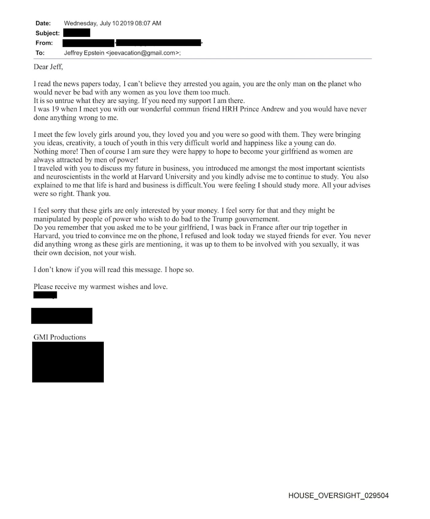 The message is indeed “supportive,” to say the least. In a July 10, 2019 email, Audrey Raimbault exudes to Epstein that he is “the only man on the planet who would never be bad with any women as you love them too much.” She denounces the accusations other women were making against him as “untrue,” and declares: “You would have never done anything wrong to me.” You can read the entire “supportive” email here, courtesy of the House Oversight Committee: