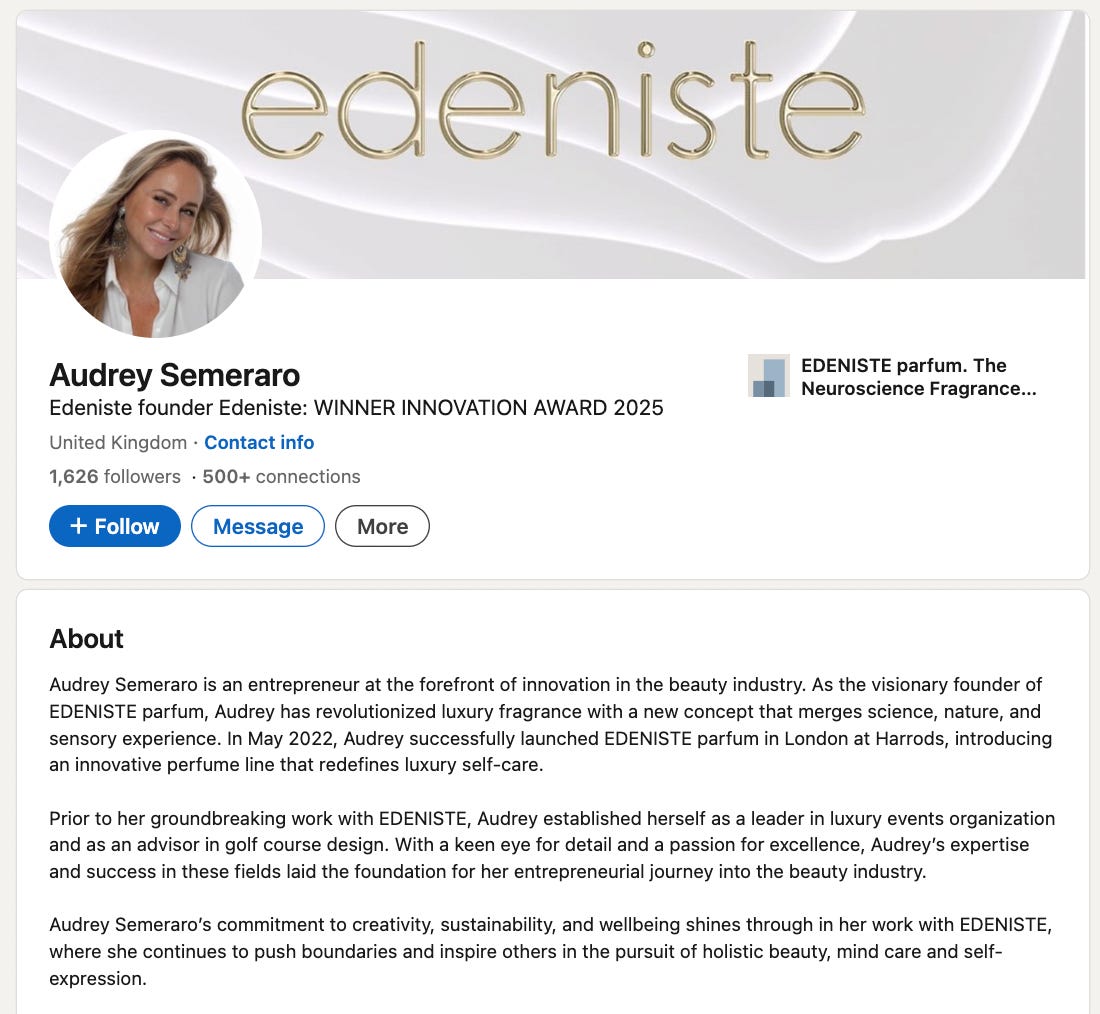 Raimbault’s main credit at present appears to be her self-description as a “visionary entrepreneur who has made significant strides in the wellness, events, and design industries.” Notably, she boasts of having secured “sponsorship for prestigious events” such as the Royal Windsor Cup, a polo tournament which she makes sure to note has been attended by “luminaries such as Her Majesty Queen Elizabeth.” She now hails herself as the founder of a highly innovative “Neuroscience” fragrance — whatever that means exactly — called EDENISTE, for which she was purportedly named a 2025 winner in “innovation,” under her name Audrey Semeraro, by something called The Fragrance Foundation.