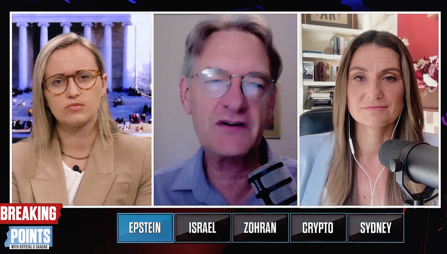 Bryant’s been a hot commodity on the podcast circuit lately. A recent video of him in conversation with Chris Hedges has over 1.2 million views. Just yesterday (July 29) he was on the inexplicably popular FLAGRANT podcast with Andrew Schulz, an individual who I gather is supposed to be some sort of comedian, but who I’ve never heard say anything funny. He’s also been on the Jimmy Dore show as their in-house Emergency Epstein Expert. And today, July 30, I saw him pop up on Breaking Points — a show I have appeared on occasionally, and which I know to abide by a modicum of journalistic standards, unlike the various failed-comedian podcasts. So despite largely ignoring Bryant up to this point, I figured I would give it a watch.