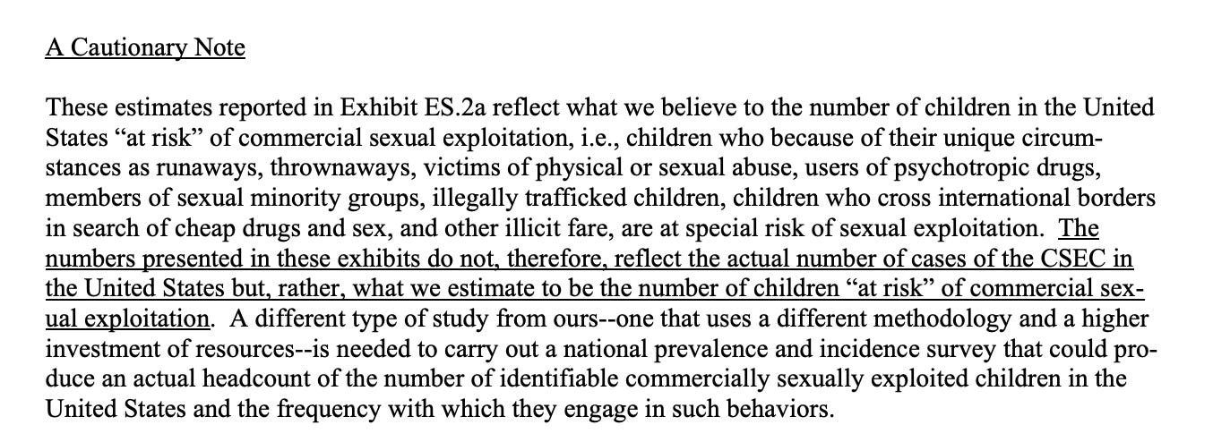Wow, sounds disturbing. OK, where is this alleged study? As expected, there is no such study that “found” what Bryant claims it found. What he’s apparently referring to is a report by Estes and Weiner (2001) which, in addition to being conspicuously out of date and employing bizarrely speculative methodology, does not remotely “find” what Bryant confidently proclaimed to the Breaking Points audience. The report offers an estimate (again, using bizarre methodology, but that’s another issue) of the number of children in the United States who are deemed “at risk” of “commercial sexual exploitation” for a host of purported reasons, such as “use of psychotropic drugs” and belonging to “sexual minority groups.” The authors explicitly state that these numbers “do not... reflect the actual number of cases” of child sexual exploitation in the United States, nor even an estimate of children/women who have been purportedly sex-trafficked, but an estimate of the number of children who could theoretically be “at risk” for exploitation. Go read the report for yourself if you want. I somehow doubt that Bryant ever read it. Here’s the relevant excerpt: