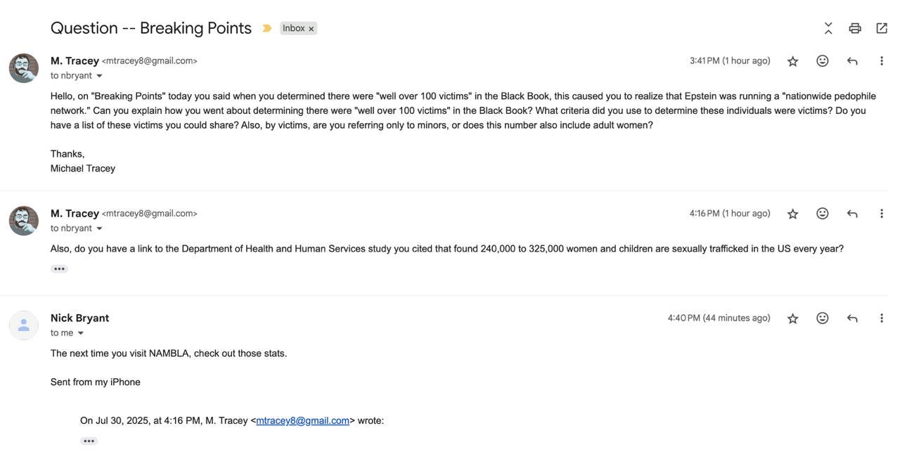 In the absence of any known factual basis for Bryant’s claim that he was able to uniquely identify “well over 100 victims” in the “Little Black Book,” and this convinced him that there was a sprawling “nationwide pedophile network” that needed urgent exposure, I tried emailing him for clarification. And he responded by calling me a pedophile. (See exchange at the end of this article.)