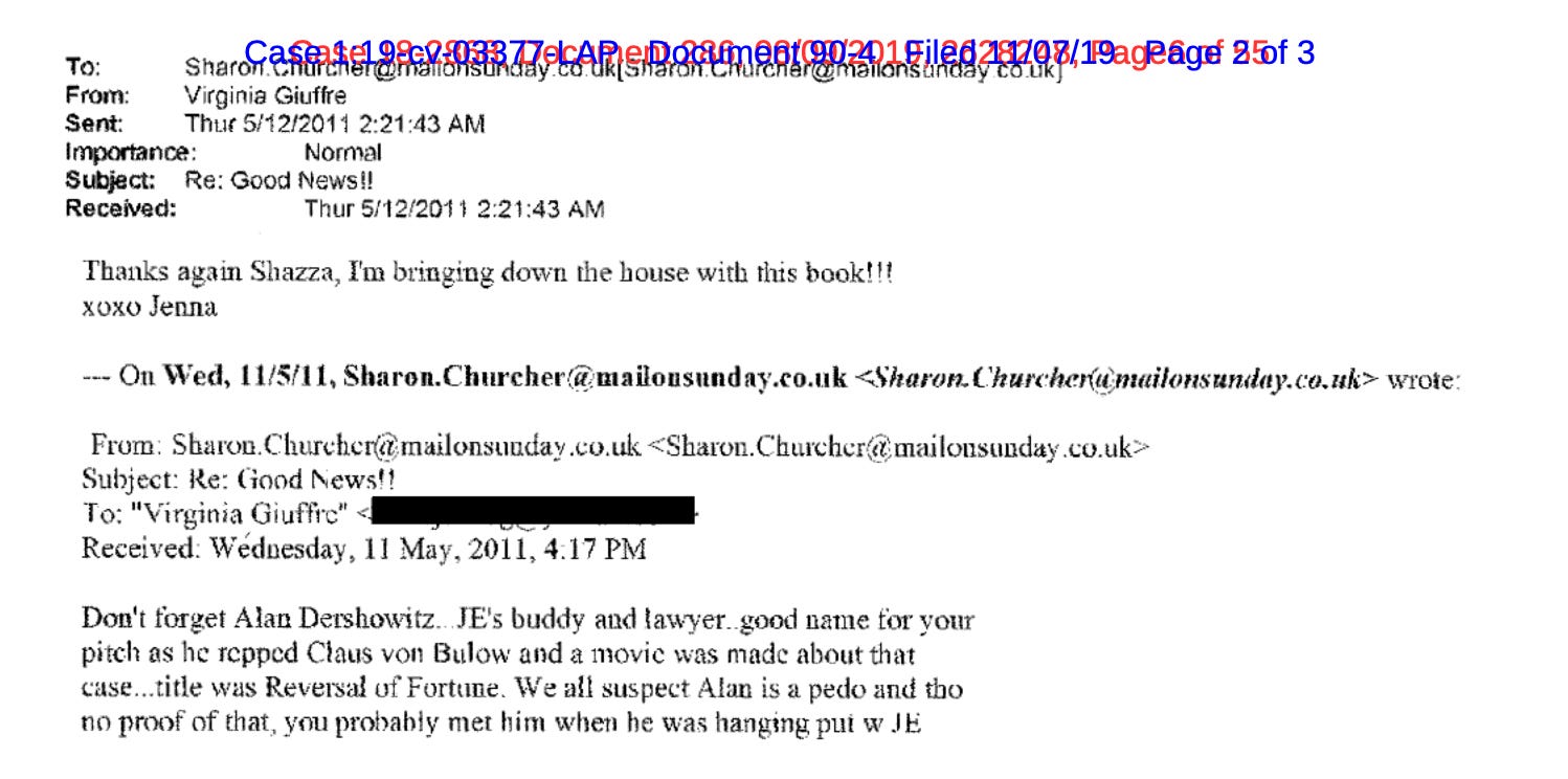 Emails eventually unearthed in civil litigation show Giuffre and the Daily Mail journalist, Sharon Churcher, conniving as to how they could get her a lucrative book deal. Ideas included throwing out whatever names of prominent people in Epstein’s orbit that Giuffre could muster, in hopes that this would entice prospective literary agents and publishers. Churcher suggests Dershowitz, an Epstein “buddy and lawyer,” who she says she suspects is a “pedo,” despite having “no proof.” Thereafter, Giuffre would go on to claim in court filings that she was indeed criminally sex-trafficked to Dershowitz on at least six occasions, until she was eventually compelled to retract the accusation.