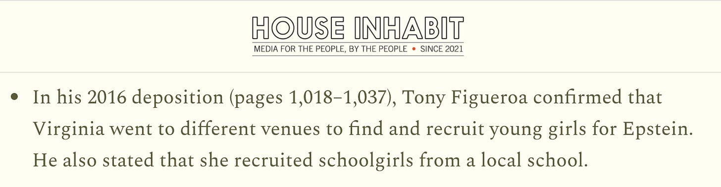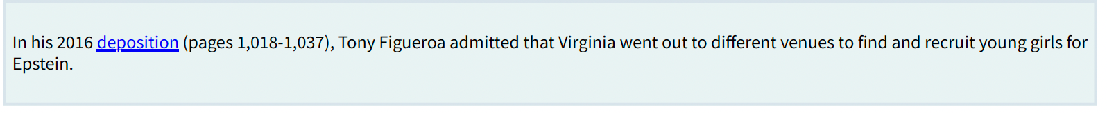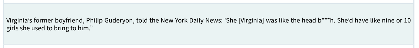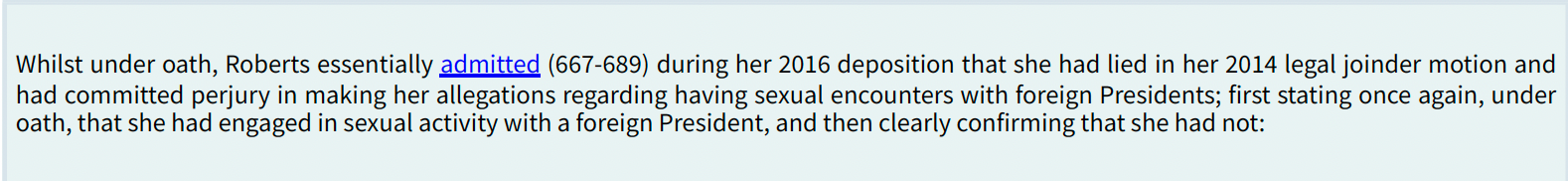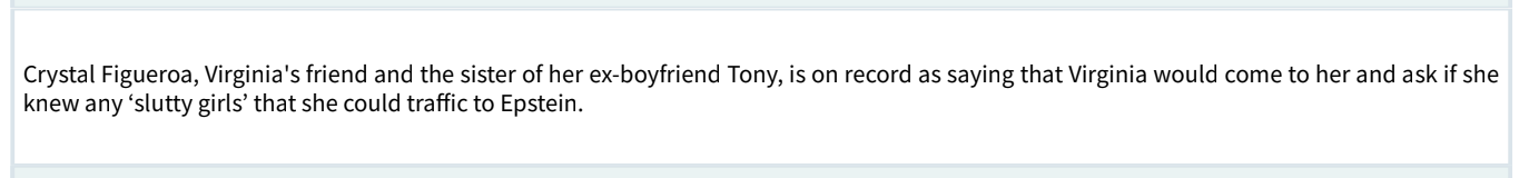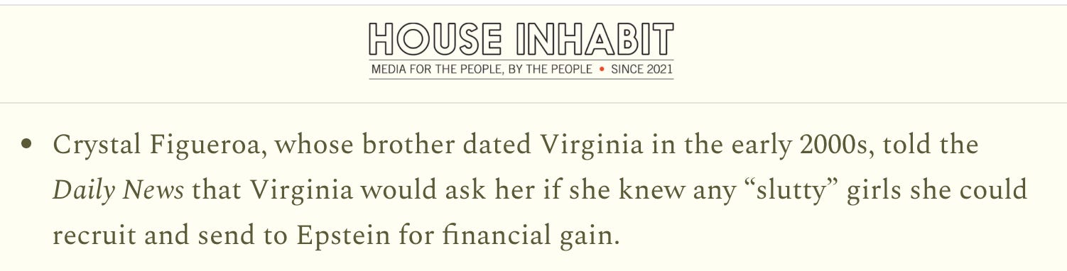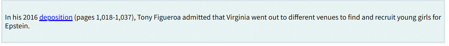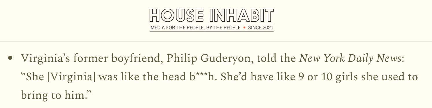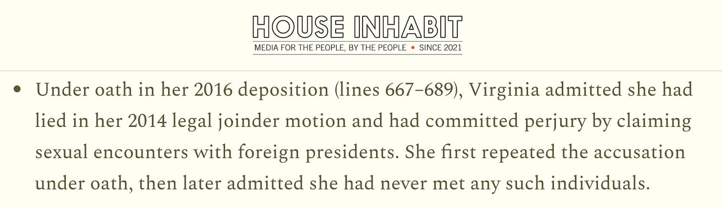 Here, she cribs and copies word-for-word from a dossier on Virginia Roberts Giuffre that I know to have been circulated, and which I’ve also seen.