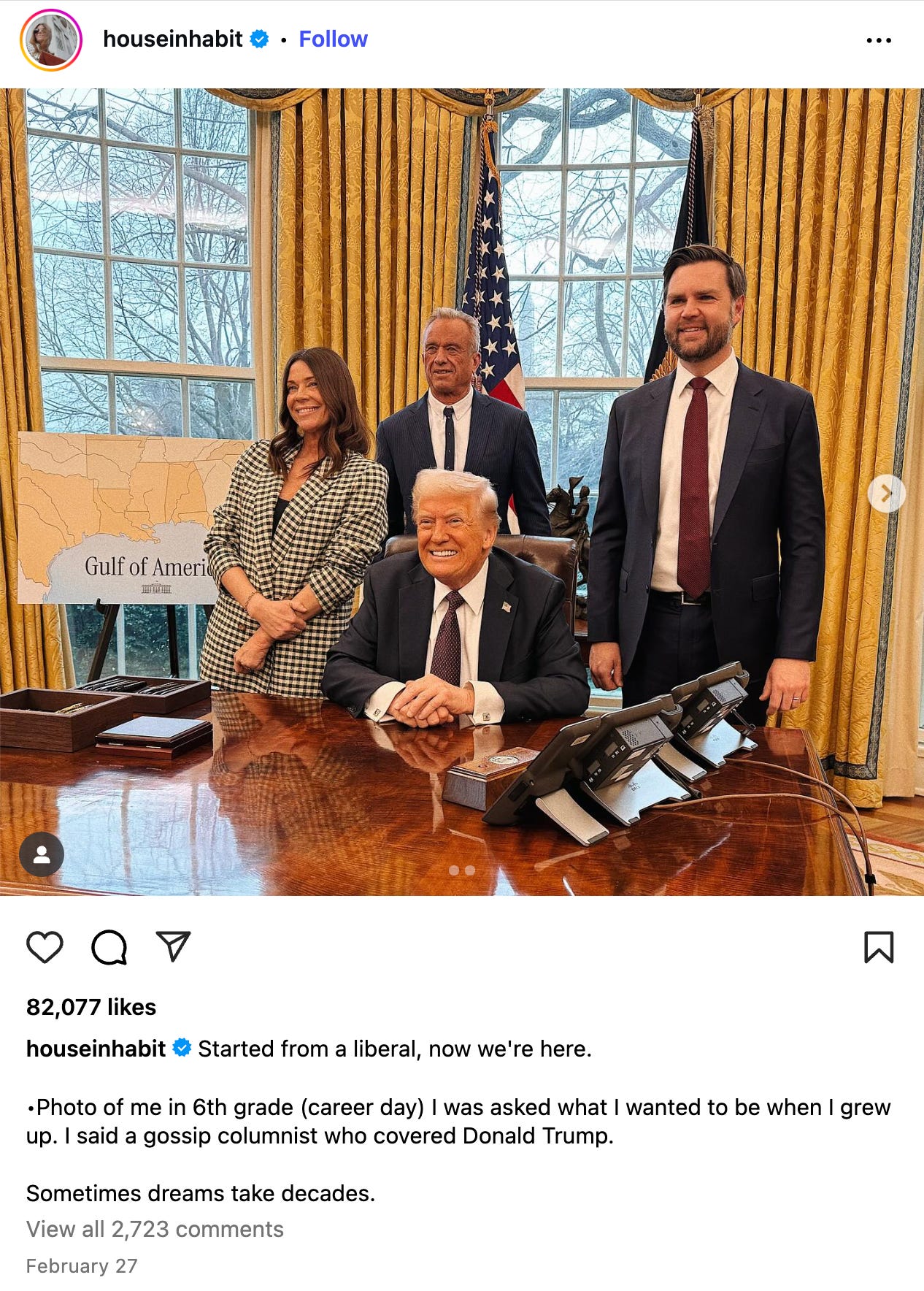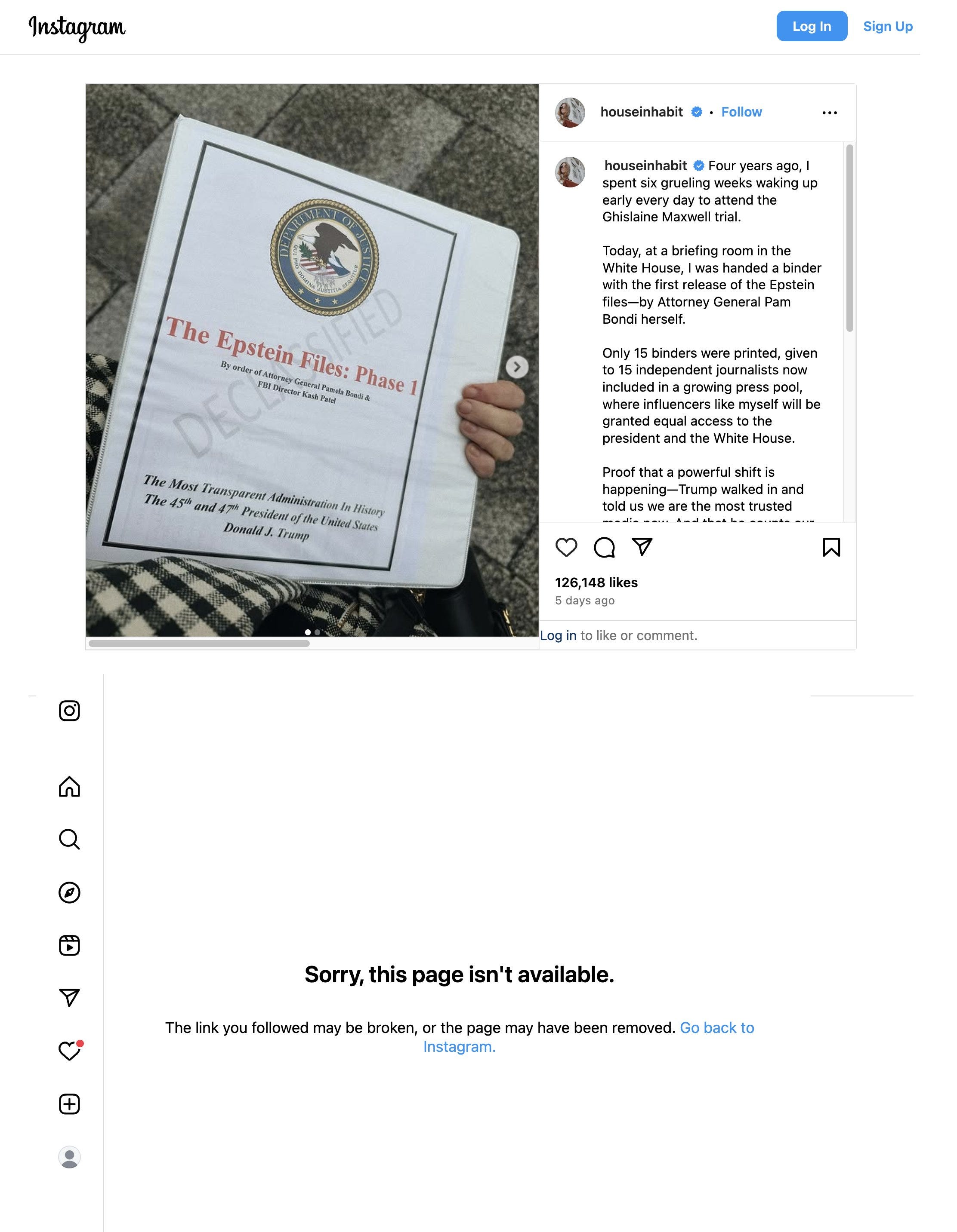 Just after publishing, I learned that this woman, Jessica Reed Kraus, was among the lucky recipients of Pam Bondi’s infamous “Epstein Files” prop binder. She later deleted her Instagram post touting what an honor it was to receive the phony binder.
