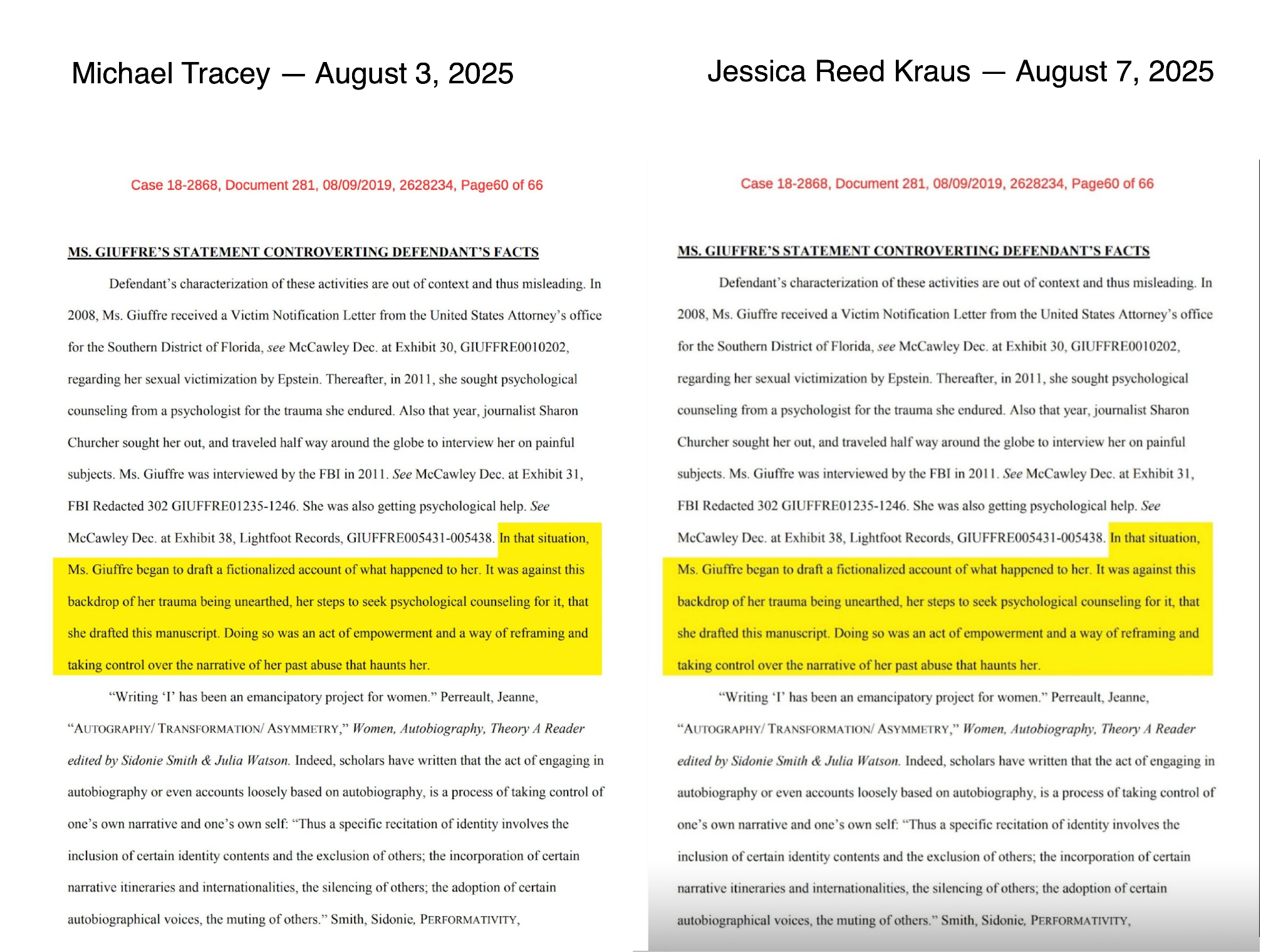 I also couldn’t help but notice that in this same article, Jessica Reed Kraus posts an excerpt from a court filing that I found and published, after spending countless hours reading through countless documents. Even the highlighter, which I added myself after conducting this original research, is identical. But four days after my article appeared, Jessica Reed Kraus posts the excerpt with no link, attribution, or citation whatsoever.