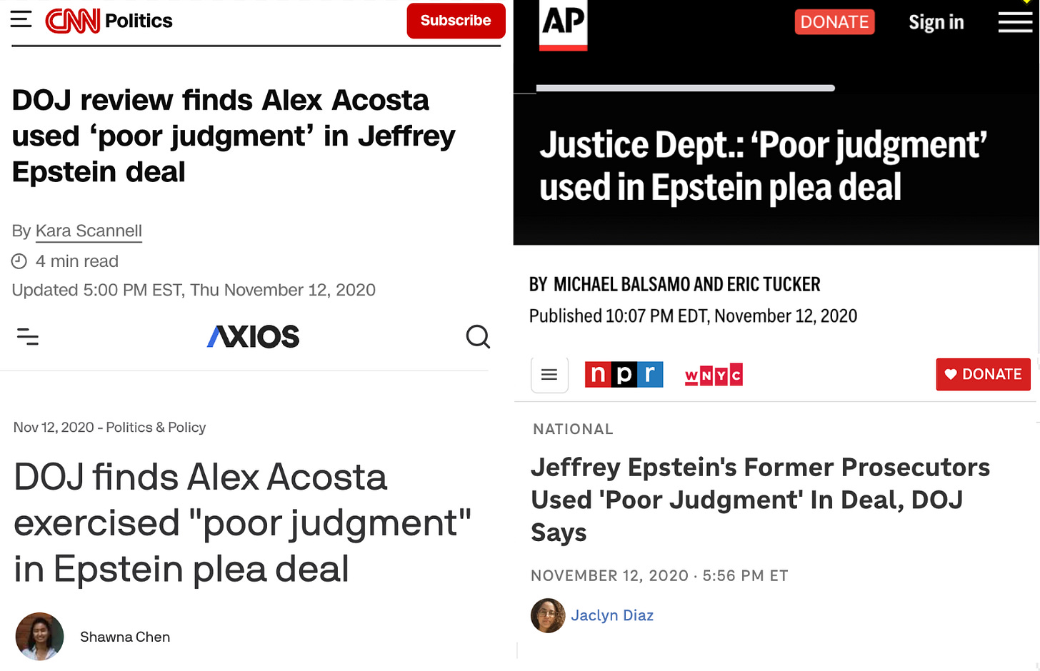 If there is one report I would most implore people to read, it would be the Department of Justice Office of Professional Responsibility report, published November 2020. I admit I hadn’t read this in full until the epic Summer of Epstein meltdown these past few weeks. So many findings in the report are absolutely incredible in how manifestly they contradict central tenets of the dogma people have constructed around Epstein. When the report was first published, just after the 2020 presidential election, all the ensuing media headlines were practically identical:
