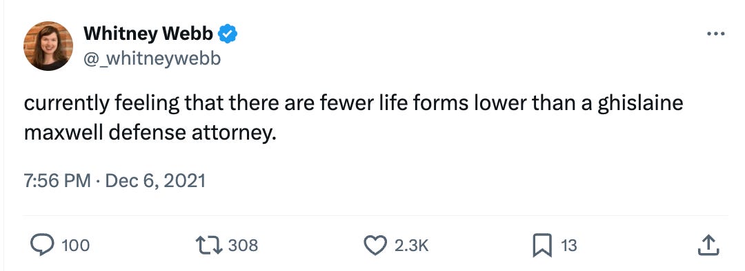 If I wanted to weave a Whitney-style “web,” I could easily use this series of curious “connections” to insinuate that Whitney Webb is “CIA” — or has vaguely colluded with “intelligence.” But that would be an outlandish inferential conclusion to draw, based on insufficient predicative facts. Still, it wouldn’t be too difficult to conjure up the story, blast it out to the online universe, and then wait for hordes of excitable commenters to shower me with unfounded praise for my extraordinary “research” skills.