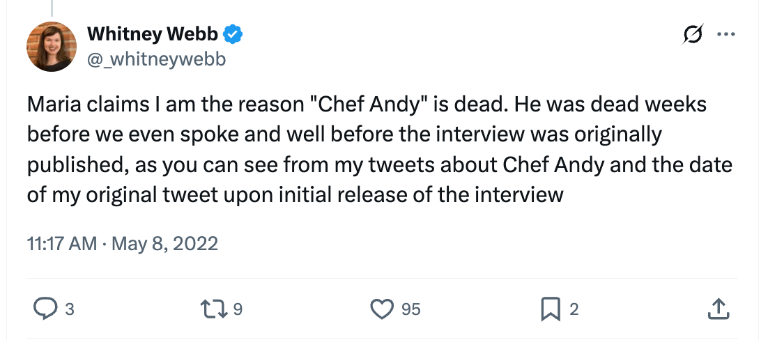 Apparently, being blamed by Maria Farmer for the death of this random Michigan chef did not give Whitney Webb any noticeable pause about using Farmer as a credible journalistic source. Webb would go on to cite Farmer in her blockbuster opus, One Nation Under Blackmail, published later in 2022 — even citing the very same interview that had allegedly resulted in a chef murder.