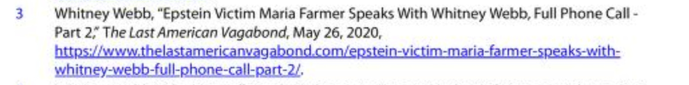 Also in 2020, Whitney Webb posted a lengthy phone interview she conducted with Maria Farmer on a previous iteration of Webb’s website, called “The Last American Vagabond.” Farmer excitedly reported to Webb that she was a huge fan of her work, and that she had even passed along her voluminous “research” to Bradley Edwards, David Boies, and Stanley Pottinger. “They’re going to use your research in court!” Farmer exuded. “Oh, that’s amazing,” Webb replies.